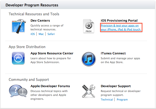 (1)登錄iOS Dev Center,登錄成功后,點擊(iOS Provisioning Portal對應(yīng)鏈接),如圖所示: