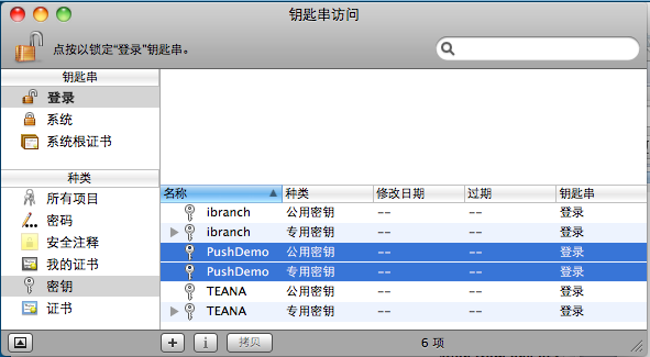 如果生成成功,則會在[鑰匙串訪問|登錄|密鑰]欄目中列出與*.certSigningRequest關(guān)聯(lián)的密鑰,這里是PushDemo,如圖所示: