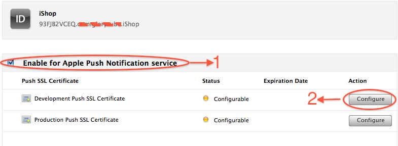 (3)配置上一步中生成的App ID,讓其支持消息推送[點擊2-6中的Configureà選中Enable for Apple Push Notification serviceà點擊Configure],如圖所示: