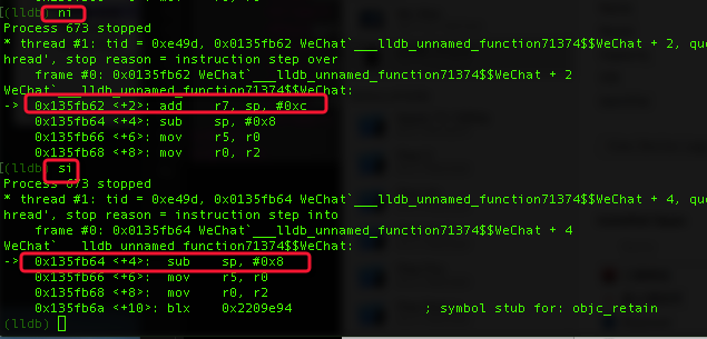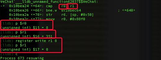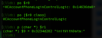 在iOS開發(fā)中,我們在使用LLDB調(diào)試時,經(jīng)常會用到po命令來輸出某個變量或者常量的值。在使用LLDB調(diào)試WeChat時,我們也可以使用某些命令來輸出寄存器中的值。我們使用$來訪問某個寄存器中的值,并且使用p命令進(jìn)行打印。下方就是通過p命令將r1寄存器中所存的內(nèi)容進(jìn)行打印,在打印之前將$r1進(jìn)行類型轉(zhuǎn)換,po命令則輸出了Objective-C的對象,而p輸出的是C語言類型的數(shù)據(jù)。如下所示: