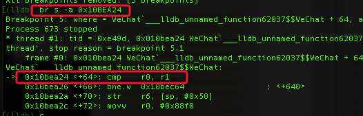 接下來我們要做的就是給0x1063a24 + 0x5b000 = 0x10BEA24 (cmp)這個內(nèi)存地址添加斷點,然后去修改寄存器r1的值。下方截圖就是給0x10BEA24這個內(nèi)存址添加了斷點,并且在輸入手機號和密碼后,點擊登錄會執(zhí)行我們添加的斷點,如下所示。在斷點出我們清楚的看到了cmp r0, r1這行ARM指令。