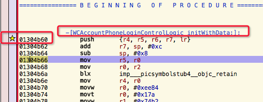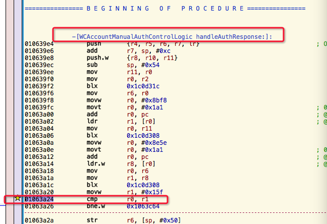 接下來我們將要通過一個實例來實戰(zhàn)一下register write這個命令,通過在Hopper中對登錄模塊的分析,我們不難發(fā)現(xiàn)“WCAccountManualAuthControlLogic”這個類中的“handleAuthResponse:”方法就是用來處理“登錄認(rèn)證響應(yīng)”的方法。也就是說“handleAuthResponse:”負(fù)責(zé)處理登錄業(yè)務(wù)邏輯的網(wǎng)絡(luò)響應(yīng),并且在這個函數(shù)的前邊有一個比較(cmp r0, r1), 根據(jù)r0和r1的比較結(jié)果來進(jìn)行跳轉(zhuǎn)。