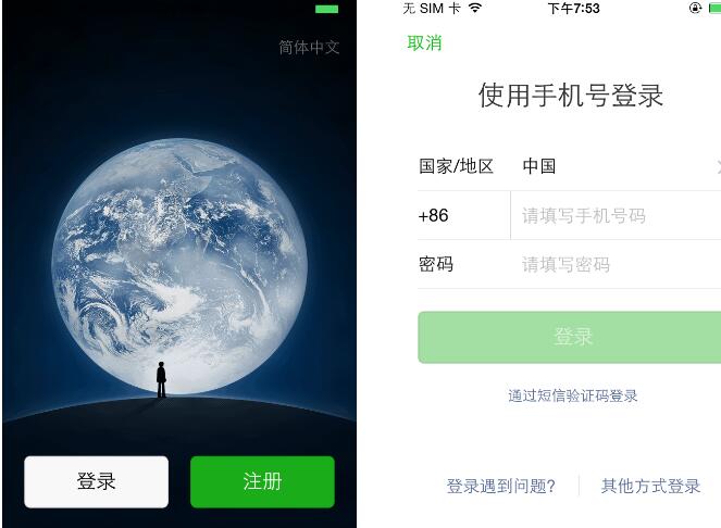 “斷點”這個東西在iOS開發(fā)中可謂是經(jīng)常使用的東西,接下來我們要做的就是給在微信點擊登錄進(jìn)行頁面跳轉(zhuǎn)時添加一個斷點。就是點擊左邊截圖的登錄按鈕往右邊頁面跳轉(zhuǎn)時添加一個斷點。我們暫且將斷點添加在右邊頁面的初始化方法中。