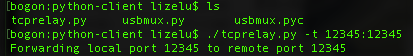 和第一部分中的內(nèi)容相同,我們使用usbmuxd進(jìn)行端口的轉(zhuǎn)發(fā),將上述的“12345”端口對接到Mac本地的某個端口,此處我們使用“12345”端口。進(jìn)入到usbmuxd-1.0.8目錄下的python-client下執(zhí)行下方的命令。