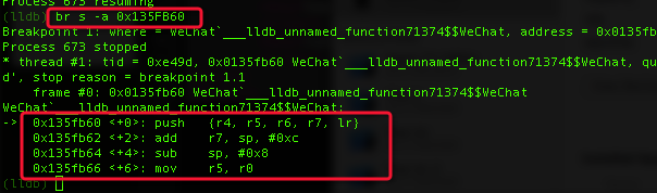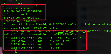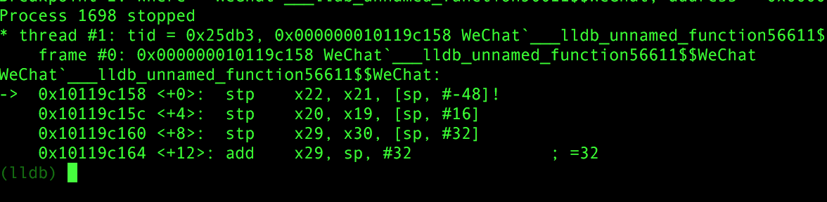 下方是連接后的結(jié)果,LLDB與debugserver建立完成后,我們就可以使用lldb來調(diào)試微信這個應(yīng)用了。