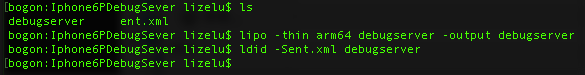 在給debugserver符權(quán)限時,我們需要使用到ldid命令,如果你的Mac上沒有安裝ldid命令,那么請用brew進(jìn)行install。執(zhí)行下方的命令行就可以給我們的debugserver賦上task_for_pid權(quán)限。需要注意的是-S與ent.xml文件名中是沒有空格的。