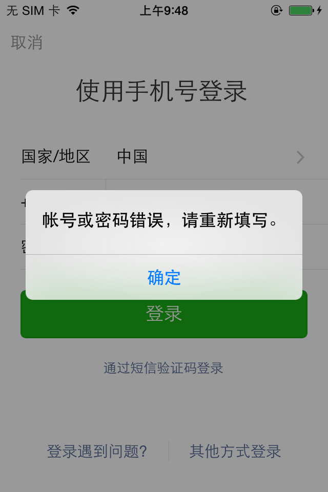 接下來我們要做的事情就是,在比較寄存器r0和r1中的值時我們要改變r1寄存器中的值,然后觀察App的運行效果。下方這個截圖是隨便輸入手機號和密碼時所提示的內(nèi)容。也就是正常的流程會彈出下方的框。