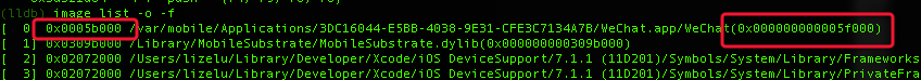 LLDB連接上debugserver后,我們首先使用下方的命令來查看當(dāng)前進(jìn)程中的所有模塊。從這些輸出信息中我們能找到“WeChat”這個進(jìn)程在虛擬內(nèi)存相對于模塊基地址的偏移量。