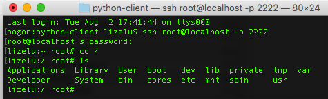 上述命令就是ssh連接的命令 -p后邊緊跟的是上述轉(zhuǎn)發(fā)的端口,執(zhí)行上述命令后,結(jié)果如下: