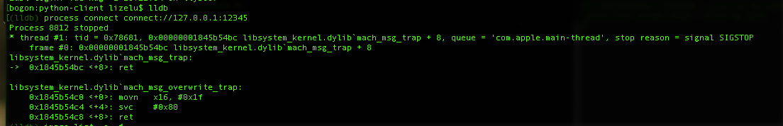 進(jìn)行端口轉(zhuǎn)發(fā)后,接下來我們就開始進(jìn)入lldb模式,然后進(jìn)行debugserver的連接了。首先在terminal上輸入lldb命令,然后輸入下方的地址進(jìn)行連接。因為我們使用usbmuxd進(jìn)行了端口的轉(zhuǎn)發(fā),因此可以使用本地的環(huán)回測試地址來進(jìn)行debugserver的連接。