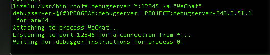在越獄設(shè)備中,我們就可以通過下方命令行來開啟debugserver了,我們此處以調(diào)試微信App為例。下方的命令就是啟動debugserver來監(jiān)聽來自任何IP地址的接入,iOS設(shè)備的接入端口是12345,所要調(diào)試的App為“WeChat”。命令如下: