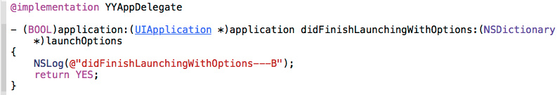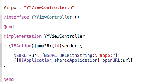 #import "YYAppDelegate.h"@implementation YYAppDelegate- (BOOL)application:(UIApplication *)application didFinishLaunchingWithOptions:(NSDictionary *)launchOptions{ NSLog(@"didFinishLaunchingWithOptions---B"); return YES;}//當一個應用程序被其他程序打開的時候會調用這個方法,在該方法中可以實現兩個應用程序間的數據局傳遞-(BOOL)application:(UIApplication *)application openURL:(NSURL *)url sourceApplication:(NSString *)sourceApplication annotation:(id)annotation{ NSLog(@"%@",url); NSLog(@"%@",sourceApplication); return YES;}