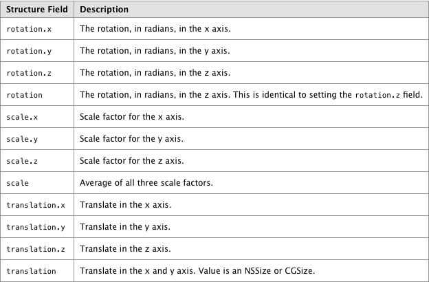 關鍵的地方在于CABasicAnimation對象的初始化方式中keyPath的設定。在iOS中有以下幾種不同的keyPath,代表著不同的效果:
