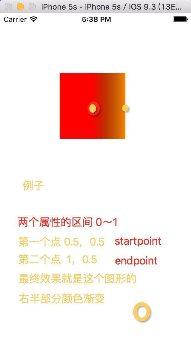 - (void)viewDidLoad { [super viewDidLoad]; // Do any additional setup after loading the view, typically from a nib. CALayer *layer = [CALayer layer]; layer.backgroundColor = [UIColor redColor].CGColor; //圓環底色 layer.frame = CGRectMake(100, 100, 110, 110); //創建一個圓環 UIBezierPath *bezierPath = [UIBezierPath bezierPathWithArcCenter:CGPointMake(55, 55) radius:50 startAngle:0 endAngle:M_PI*2 clockwise:YES]; //圓環遮罩 CAShapeLayer *shapeLayer = [CAShapeLayer layer]; shapeLayer.fillColor = [UIColor clearColor].CGColor; shapeLayer.strokeColor = [UIColor redColor].CGColor; shapeLayer.lineWidth = 5; shapeLayer.strokeStart = 0; shapeLayer.strokeEnd = 0.8; shapeLayer.lineCap = @"round"; shapeLayer.lineDashPhase = 0.8; shapeLayer.path = bezierPath.CGPath; //顏色漸變 NSMutableArray *colors = [NSMutableArray arrayWithObjects:(id)[UIColor redColor].CGColor,(id)[UIColor whiteColor].CGColor, nil]; CAGradientLayer *gradientLayer = [CAGradientLayer layer]; gradientLayer.shadowPath = bezierPath.CGPath; gradientLayer.frame = CGRectMake(50, 50, 60, 60); gradientLayer.startPoint = CGPointMake(0, 1); gradientLayer.endPoint = CGPointMake(1, 0); [gradientLayer setColors:[NSArray arrayWithArray:colors]]; [layer addSublayer:gradientLayer]; //設置顏色漸變 [layer setMask:shapeLayer]; //設置圓環遮罩 [self.view.layer addSublayer:layer]; //動畫 CABasicAnimation *scaleAnimation1 = [CABasicAnimation animationWithKeyPath:@"transform.scale"]; scaleAnimation1.fromValue = [NSNumber numberWithFloat:1.0]; scaleAnimation1.toValue = [NSNumber numberWithFloat:1.5]; scaleAnimation1.autoreverses = YES;// scaleAnimation1.fillMode = kCAFillModeForwards; scaleAnimation1.duration = 0.8; CABasicAnimation *rotationAnimation2 = [CABasicAnimation animationWithKeyPath:@"transform.rotation.z"]; rotationAnimation2.fromValue = [NSNumber numberWithFloat:0]; rotationAnimation2.toValue = [NSNumber numberWithFloat:6.0*M_PI]; rotationAnimation2.autoreverses = YES;// scaleAnimation.fillMode = kCAFillModeForwards; rotationAnimation2.repeatCount = MAXFLOAT; rotationAnimation2.beginTime = 0.8; //延時執行,注釋掉動畫會同時進行 rotationAnimation2.duration = 2; //組合動畫 CAAnimationGroup *groupAnnimation = [CAAnimationGroup animation]; groupAnnimation.duration = 4; groupAnnimation.autoreverses = YES; groupAnnimation.animations = @[scaleAnimation1, rotationAnimation2]; groupAnnimation.repeatCount = MAXFLOAT; [layer addAnimation:groupAnnimation forKey:@"groupAnnimation"];}- (void)didReceiveMemoryWarning { [super didReceiveMemoryWarning]; // Dispose of any resources that can be recreated.}@end