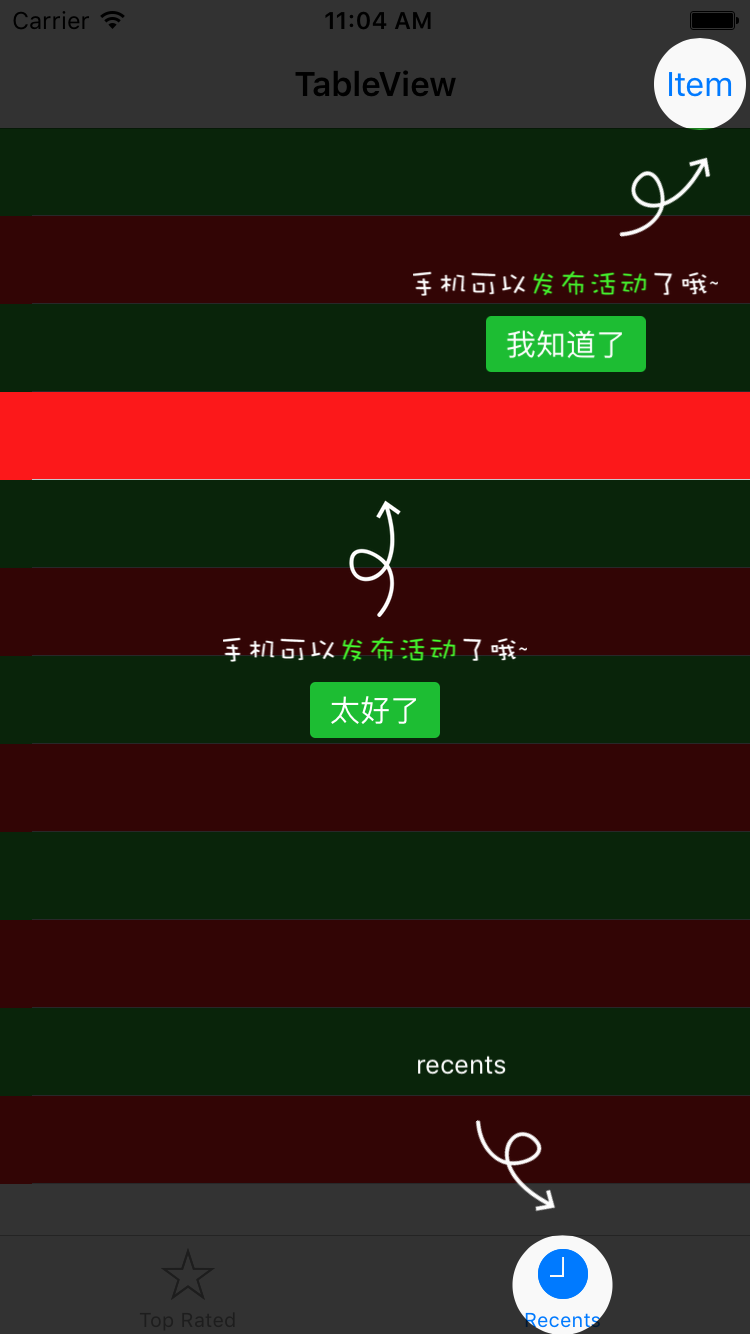 EAFeatureItem *item = [[EAFeatureItem alloc] initWithFocusView:self.exampleCell focusCornerRadius:0 focusInsets:UIEdgeInsetsZero];item.introduce = @"txt_feature_post_activity_4.1.png";item.actionTitle = @"太好了";item.action = ^(id sender){ NSLog(@"touched .."); };EAFeatureItem *recents = [[EAFeatureItem alloc] initWithFocusRect:CGRectMake(centerX - 25, centerY - 25, 50, 50) focusCornerRadius:25 focusInsets:UIEdgeInsetsZero]; recents.introduce = @"recents";[self.navigationController.view showWithFeatureItems:@[item, recents] saveKeyName:@"keyName" inVersion:nil];