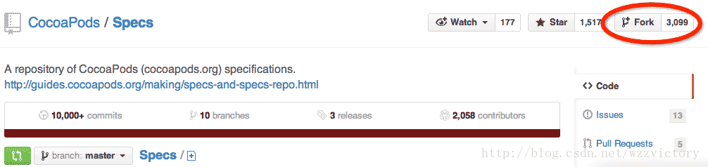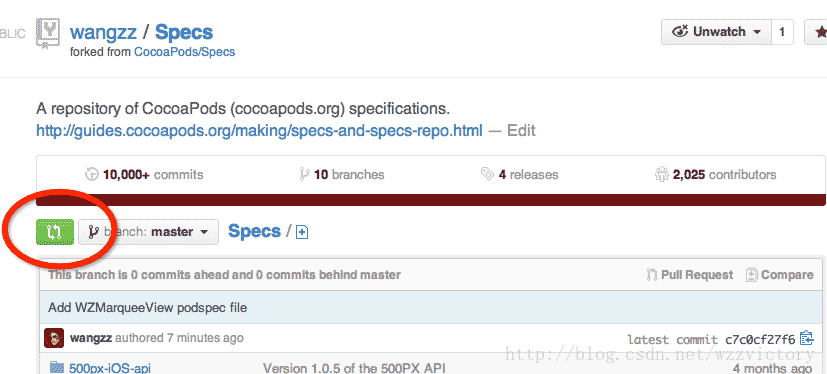 要想一個Pods依賴庫真正可用,還需要做最后一步操作,將我們剛才生成的podspec文件上傳到CocoaPods官方的Specs倉庫中,鏈接為:https://github.com/CocoaPods/Specs