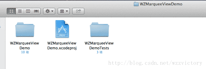 為了快速地教會別人使用我們的Pods依賴庫,通常需要提供一個demo工程。我創建的demo工程放到了一個名為WZMarqueeViewDemo的文件夾中,該目錄包含的文件如下圖所示: