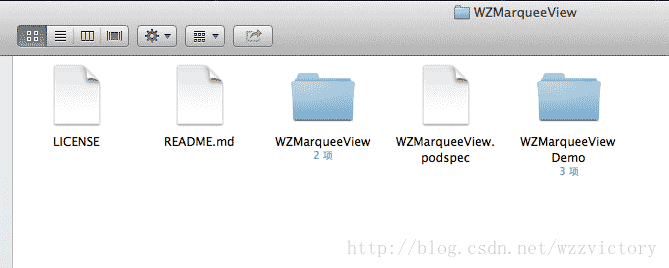 創建Pods依賴庫就是為了方便別人使用我們的成果,比如我想共享給大家的WZMarqueeView類,是我想提供給廣大用戶使用的,這個類自然是必不可少的。我把這個類包含的兩個文件放到一個名稱為WZMarqueeView的文件夾中,對應的目錄結構如圖:
