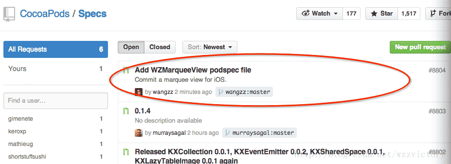 當然我們也能查看審核進度,打開這個鏈接:https://github.com/CocoaPods/Specs/pulls,這里能看到所有的Specs倉庫pull請求,如下圖: