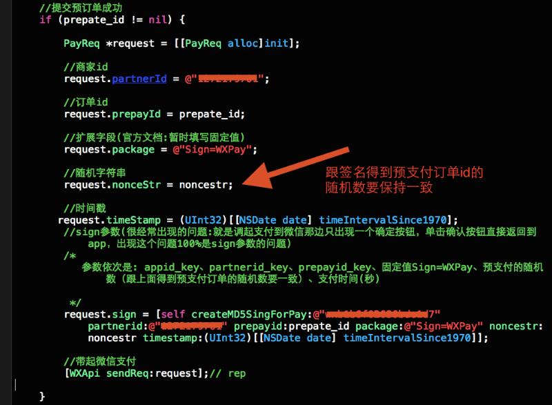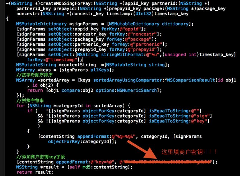 -(NSString )createMD5SingForPay:(NSString )appid_key partnerid:(NSString)partnerid_key prepayid:(NSString )prepayid_key package:(NSString )package_key noncestr:(NSString)noncestr_key timestamp:(UInt32)timestamp_key { NSMutableDictionary *signParams = [NSMutableDictionary dictionary]; [signParams setObject:appid_key forKey:@”appid”]; [signParams setObject:noncestr_key forKey:@”noncestr”]; [signParams setObject:package_key forKey:@”package”]; [signParams setObject:partnerid_key forKey:@”partnerid”]; [signParams setObject:prepayid_key forKey:@”prepayid”]; [signParams setObject:[NSString stringWithFormat:@”%u”,(unsigned int)timestamp_key] forKey:@”timestamp”];NSMutableString *contentString =[NSMutableString string]; NSArray *keys = [signParams allKeys]; //按字母順序排序 NSArray *sortedArray = [keys sortedArrayUsingComparator:^NSComparisonResult(id obj1, id obj2) {return [obj1 compare:obj2 options:NSNumericSearch]; }]; //拼接字符串 for (NSString *categoryId in sortedArray) { if ( ![[signParams objectForKey:categoryId] isEqualToString:@”“] && ![[signParams objectForKey:categoryId] isEqualToString:@”sign”] && ![[signParams objectForKey:categoryId] isEqualToString:@”key”] ) { [contentString appendFormat:@”%@=%@&”, categoryId, [signParams objectForKey:categoryId]];} } //添加商戶密鑰key字段 [contentString appendFormat:@”key=%@”, @”這里填寫(xiě)商戶密鑰”]; NSString *result = [self md5:contentString]; return result;}//創(chuàng)建發(fā)起支付時(shí)的sige簽名-(NSString ) md5:(NSString )str { const char *cStr = [str UTF8String]; unsigned char result[16]= “0123456789abcdef”; CC_MD5(cStr, (CC_LONG)strlen(cStr), result); //這里的x是小寫(xiě)則產(chǎn)生的md5也是小寫(xiě),x是大寫(xiě)則md5是大寫(xiě),這里只能用大寫(xiě),微信的大小寫(xiě)驗(yàn)證很逗 return [NSString stringWithFormat: @”%02X%02X%02X%02X%02X%02X%02X%02X%02X%02X%02X%02X%02X%02X%02X%02X”, result[0], result[1], result[2], result[3], result[4], result[5], result[6], result[7], result[8], result[9], result[10], result[11], result[12], result[13], result[14], result[15] ]; }//MD5 加密