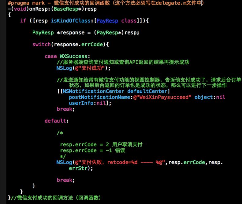 這個(gè)有必要說(shuō)明下,官方文檔是這樣說(shuō)明的:不能以客服端支付成功的結(jié)果就直接當(dāng)做是訂單支付成功的結(jié)果,要以服務(wù)器返回的訂單狀態(tài)為準(zhǔn),也就是說(shuō),客服端支付成功后,微信支付平臺(tái)會(huì)給服務(wù)器發(fā)送支付成功的消息,后臺(tái)修改訂單狀態(tài),重新返回給客戶端。簡(jiǎn)單就是,支付成功要發(fā)送給特定的視圖控制器(帶有微信支付功能的視圖控制器)發(fā)送通知,讓這個(gè)特定的視圖控制去請(qǐng)求服務(wù)器訂單的住狀態(tài)。這個(gè)回調(diào)函數(shù)必須寫(xiě)在delegate.m中!!!