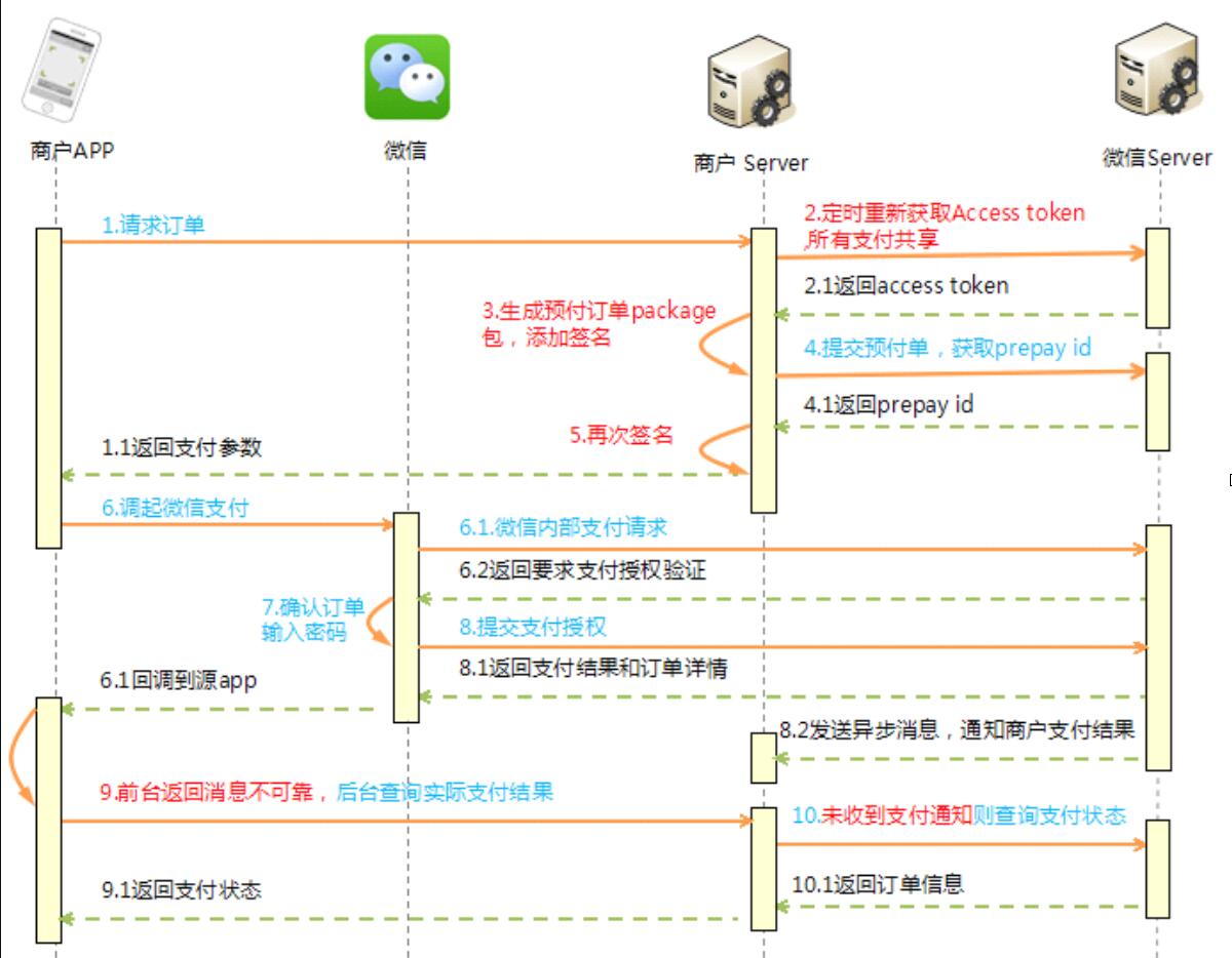 用戶,商戶的App客戶端,商戶的后臺系統,微信客戶端,微信的支付系統;