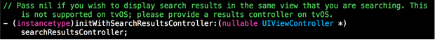 系統(tǒng)的注釋說的很清楚,如果想要在當前頁顯示搜索結果,這個方法的參數填nil即可,為了方便起見,聲明一個UISearchController