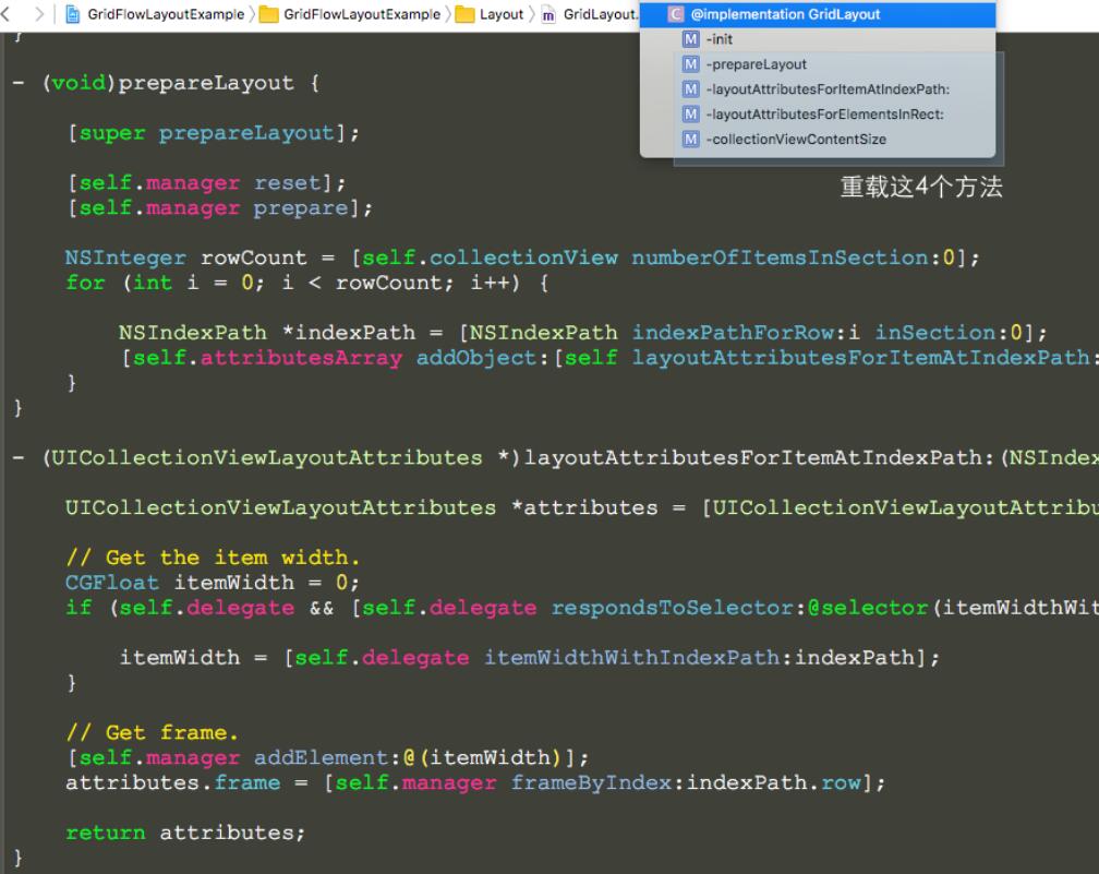 //// GridFlowLayoutViewController.m// Animations//// Created by YouXianMing on 16/5/5.// Copyright © 2016年 YouXianMing. All rights reserved.//#import "GridFlowLayoutViewController.h"#import "UIView+SetRect.h"#import "GridLayout.h"#import "FlowStyleCell.h"#import "FileManager.h"#import "NSString+MD5.h"#import "NSData+JSONData.h"#import "ResponseData.h"#import "Math.h"#import "GCD.h"static NSString *picturesSource = @"http://www.duitang.com/album/1733789/masn/p/0/50/";@interface GridFlowLayoutViewController () <UICollectionViewDataSource, UICollectionViewDelegate, GridLayoutDelegate>@property (nonatomic, strong) UICollectionView *collectionView;@property (nonatomic) CGFloat rowHeight;@property (nonatomic, strong) NSMutableArray *datas;@property (nonatomic, strong) ResponseData *picturesData;@property (nonatomic, strong) NSMutableArray <WaterfallPictureModel *> *dataSource;@end@implementation GridFlowLayoutViewController- (void)setup { [super setup]; _dataSource = [NSMutableArray new]; // 初始化布局文件 CGFloat gap = 1; NSInteger rowCount = arc4random() % 3 + 2; _rowHeight = (self.contentView.height - (rowCount + 1) * gap) / (CGFloat)rowCount; GridLayout *layout = [GridLayout new]; layout.manager.edgeInsets = UIEdgeInsetsMake(gap, gap, gap, gap); layout.manager.gap = gap; layout.delegate = self; NSMutableArray *rowHeights = [NSMutableArray array]; for (int i = 0; i < rowCount; i++) { [rowHeights addObject:@(_rowHeight)]; } layout.manager.rowHeights = rowHeights; self.collectionView = [[UICollectionView alloc] initWithFrame:self.contentView.bounds collectionViewLayout:layout]; self.collectionView.delegate = self; self.collectionView.dataSource = self; self.collectionView.backgroundColor = [UIColor clearColor]; self.collectionView.showsHorizontalScrollIndicator = NO; self.collectionView.alpha = 0; [self.collectionView registerClass:[FlowStyleCell class] forCellWithReuseIdentifier:@"FlowStyleCell"]; [self.contentView addSubview:self.collectionView]; // 獲取數(shù)據(jù) [GCDQueue executeInGlobalQueue:^{ NSString *string = [picturesSource lowerMD532BitString]; NSString *realFilePath = [FileManager theRealFilePath:[NSString stringWithFormat:@"~/Documents/%@", string]]; NSData *data = nil; if ([FileManager fileExistWithRealFilePath:realFilePath] == NO) { data = [[NSData alloc] initWithContentsOfURL:[NSURL URLWithString:picturesSource]]; [data writeToFile:realFilePath atomically:YES]; } else { data = [NSData dataWithContentsOfFile:realFilePath]; } NSDictionary *dataDic = [data toListProperty]; [GCDQueue executeInMainQueue:^{ self.picturesData = [[ResponseData alloc] initWithDictionary:dataDic]; if (self.picturesData.success.integerValue == 1) { for (int i = 0; i < self.picturesData.data.blogs.count; i++) { [_dataSource addObject:self.picturesData.data.blogs[i]]; } [_collectionView reloadData]; [UIView animateWithDuration:0.5f animations:^{ _collectionView.alpha = 1.f; }]; } }]; }];}- (NSInteger)collectionView:(UICollectionView *)collectionView numberOfItemsInSection:(NSInteger)section { return self.dataSource.count;}- (UICollectionViewCell *)collectionView:(UICollectionView *)collectionView cellForItemAtIndexPath:(NSIndexPath *)indexPath { WaterfallPictureModel *pictureModel = _dataSource[indexPath.row]; FlowStyleCell *cell = [collectionView dequeueReusableCellWithReuseIdentifier:@"FlowStyleCell" forIndexPath:indexPath]; cell.indexPath = indexPath; cell.data = pictureModel; cell.rowHeight = _rowHeight; [cell loadContent]; return cell;}- (CGFloat)itemWidthWithIndexPath:(NSIndexPath *)indexPath { WaterfallPictureModel *pictureModel = _dataSource[indexPath.row]; return [Math resetFromSize:CGSizeMake(pictureModel.iwd.floatValue, pictureModel.iht.floatValue) withFixedHeight:_rowHeight].width;}@end