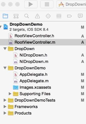 #import "RootViewController.h"#import "NIDropDown.h"@interface RootViewController ()@end@implementation RootViewController- (id)initWithNibName:(NSString *)nibNameOrNil bundle:(NSBundle *)nibBundleOrNil{ self = [super initWithNibName:nibNameOrNil bundle:nibBundleOrNil]; if (self) { // Custom initialization } return self;}- (void)viewDidLoad{ [super viewDidLoad]; // Do any additional setup after loading the view. self.title=@"DropDown"; UIButton *button=[UIButton buttonWithType:UIButtonTypeRoundedRect]; button.frame=CGRectMake(10, 100, 150,30); button.backgroundColor=[UIColor redColor]; [button addTarget:self action:@selector(doClickAction:) forControlEvents:UIControlEventTouchUpInside]; [self.view addSubview:button]; }-(void)doClickAction:(UIButton *)btn{ NSArray *dataArray=[NSArray arrayWithObjects:@"1",@"2",@"3",@"4",@"5", nil]; NIDropDown *dropDown=[[NIDropDown alloc]init]; [dropDown showDropDown:btn andHeight:[dataArray count]*36 andData:dataArray]; [self.view addSubview:dropDown];}