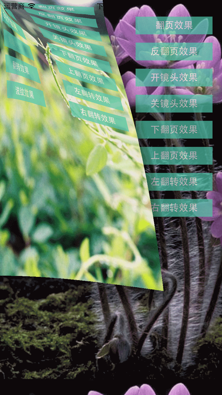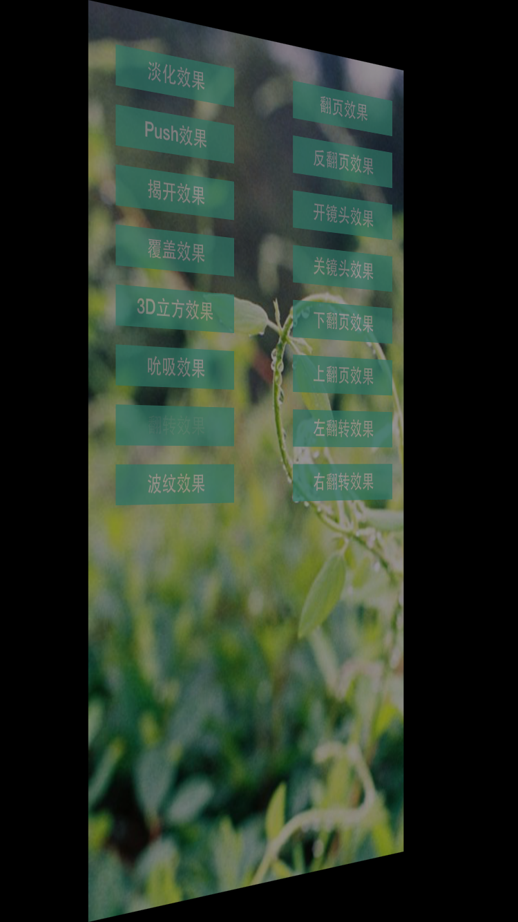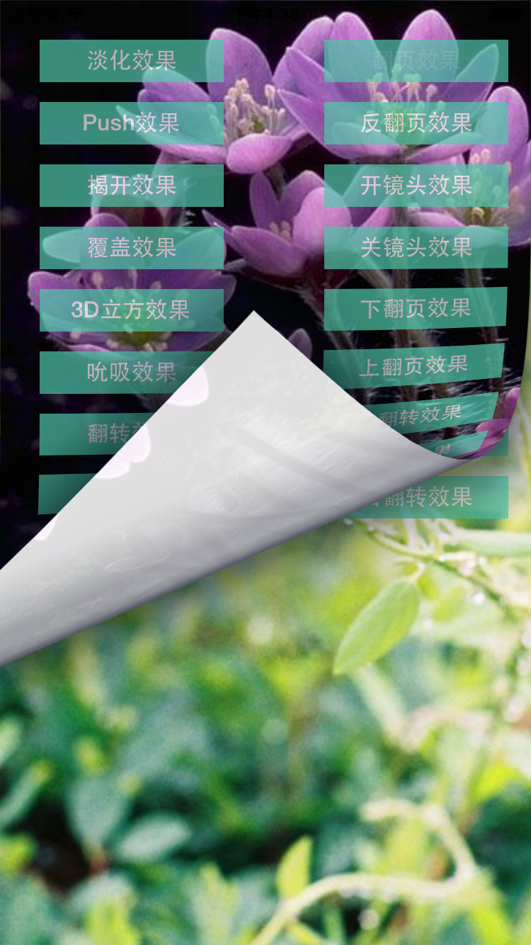 case CurlDown:[self animationWithView:self.view WithAnimationTransition:UIViewAnimationTransitionCurlDown];break;case CurlUp:[self animationWithView:self.view WithAnimationTransition:UIViewAnimationTransitionCurlUp];break;case FlipFromLeft:[self animationWithView:self.view WithAnimationTransition:UIViewAnimationTransitionFlipFromLeft];break;case FlipFromRight:[self animationWithView:self.view WithAnimationTransition:UIViewAnimationTransitionFlipFromRight];break;