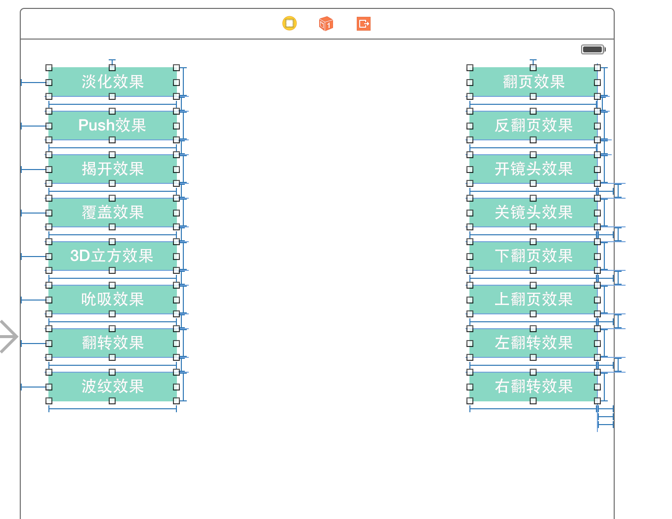 1.我們在View上添加多個Button,給不同的Button設置不同的Tag值,然后再ViewController中綁定同一個方法,點擊不同的button實現不同的頁面切換效果。storyBoard上的控件效果如下圖所示: