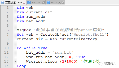 Dim wshDim current_dirDim run_modeDim bat_addrMsgBox "此腳本旨在定期運行python語句"Set wsh = CreateObject("Wscript.Shell")current_dir = wsh.currentdirectoryDo While True bat_addr = "run.bat" wsh.run bat_addr, 0, True Wscript.sleep (2*1000) '休息2秒 Loop代碼截圖