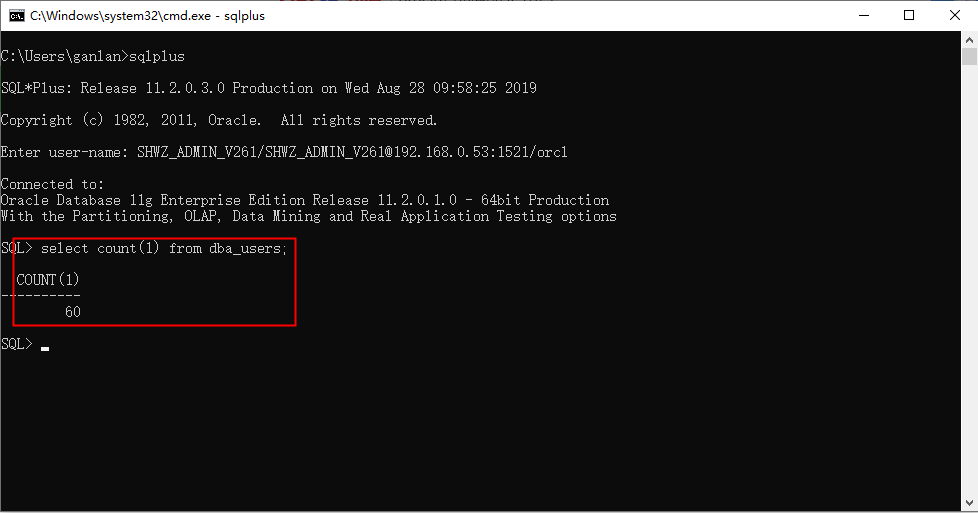 5、執(zhí)行查詢用戶數(shù)量語句 :select count(1) from dba_users;
