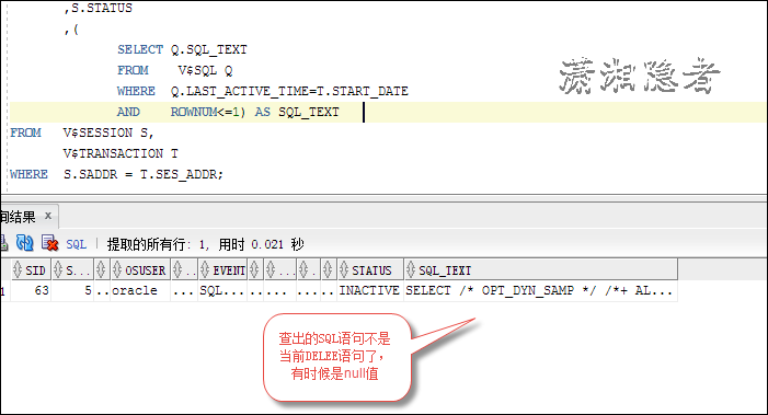 SELECT S.SID ,S.SERIAL# ,S.USERNAME ,S.OSUSER ,S.PROGRAM ,S.EVENT ,TO_CHAR(S.LOGON_TIME,'YYYY-MM-DD HH24:MI:SS') ,TO_CHAR(T.START_DATE,'YYYY-MM-DD HH24:MI:SS') ,S.LAST_CALL_ET ,S.BLOCKING_SESSION ,S.STATUS ,( SELECT Q.SQL_TEXT FROM V$SQL Q WHERE Q.LAST_ACTIVE_TIME=T.START_DATE AND ROWNUM<=1) AS SQL_TEXT FROM V$SESSION S, V$TRANSACTION T WHERE S.SADDR = T.SES_ADDR;