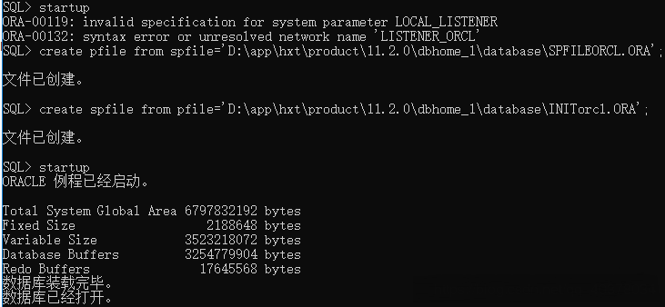 SQL> create spfile from pfile='D:/app/hxt/product/11.2.0/dbhome_1/database/INITorcl.ORA';