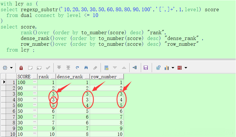 with lcy as (select regexp_substr('10,20,30,30,50,60,80,80,90,100','[^,]+',1,level) score from dual connect by level <= 10)select score, rank()over (order by to_number(score) desc) "rank", dense_rank()over (order by to_number(score) desc) "dense_rank" , row_number()over (order by to_number(score) desc) "row_number" from lcy ;解釋可能不夠詳細,但我覺得截圖展示更直觀一點。