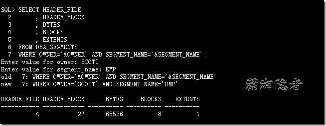 SQL> CREATE TABLESPACE TBS_TEST_DATA 2 DATAFILE '/u03/oradata/gsp/tbs_test_data_001.dbf' 3 SIZE 20M 4 EXTENT MANAGEMENT LOCAL AUTOALLOCATE 5 SEGMENT SPACE MANAGEMENT MANUAL ONLINE; Tablespace created. SQL> create user test identified by test123456 2 default tablespace tbs_test_data; User created. SQL> grant connect, resource to test; Grant succeeded. SQL> CREATE TABLE TEST.KKK 2 AS 3 SELECT * FROM DBA_OBJECTS; Table created. SQL> COL SEGMENT_NAME FOR A32;SQL> SELECT SEGMENT_NAME 2 ,FILE_ID 3 ,BLOCK_ID 4 ,BLOCKS 5 FROM DBA_EXTENTS 6 WHERE SEGMENT_NAME='KKK' AND OWNER='TEST' 7 ORDER BY BLOCK_ID ASC; SEGMENT_NAME FILE_ID BLOCK_ID BLOCKS-------------------------------- ---------- ---------- ----------KKK 39 427785 128KKK 43 435249 8KKK 43 435257 8KKK 43 435265 8KKK 43 435273 8KKK 43 435281 8KKK 43 435289 8KKK 43 435297 8KKK 43 435305 8KKK 43 435313 8KKK 43 435321 8 SEGMENT_NAME FILE_ID BLOCK_ID BLOCKS-------------------------------- ---------- ---------- ----------KKK 43 435329 8KKK 48 436745 8KKK 48 436753 8KKK 48 436761 8KKK 48 436769 8KKK 48 436777 8KKK 48 436873 128KKK 40 444297 128KKK 43 447241 128KKK 52 449545 128KKK 2 458249 128 22 rows selected. SQL> SELECT HEADER_FILE 2 , HEADER_BLOCK 3 , BYTES 4 , BLOCKS 5 , EXTENTS 6 FROM DBA_SEGMENTS 7 WHERE OWNER='TEST' AND SEGMENT_NAME='KKK'; HEADER_FILE HEADER_BLOCK BYTES BLOCKS EXTENTS----------- ------------ ---------- ---------- ---------- 43 435249 7340032 896 22 SQL>