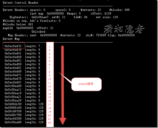 Segment Header是一個Segment的第一個extent的頭塊(第一個塊)。在FLM管理的Segment中,header block始終是segment 的第一個塊。 如下所示,在Extent Map中,第一個區間的地址為0x0ac6a432, 恰恰跟segment header的塊地址 0x0ac6a431 相差為1,這意味著后面的分配是緊挨著segment header的塊地址。 所以在手工段空間管理(Manual Segment Space Management)的表空間,不能以block_id的大小順序來看區間分配順序。也就是說FILE_ID=39 BLOCK_ID=427785的塊并不是第一個區間的第一個塊。這也是我在實驗當中糾結了好久的地方。