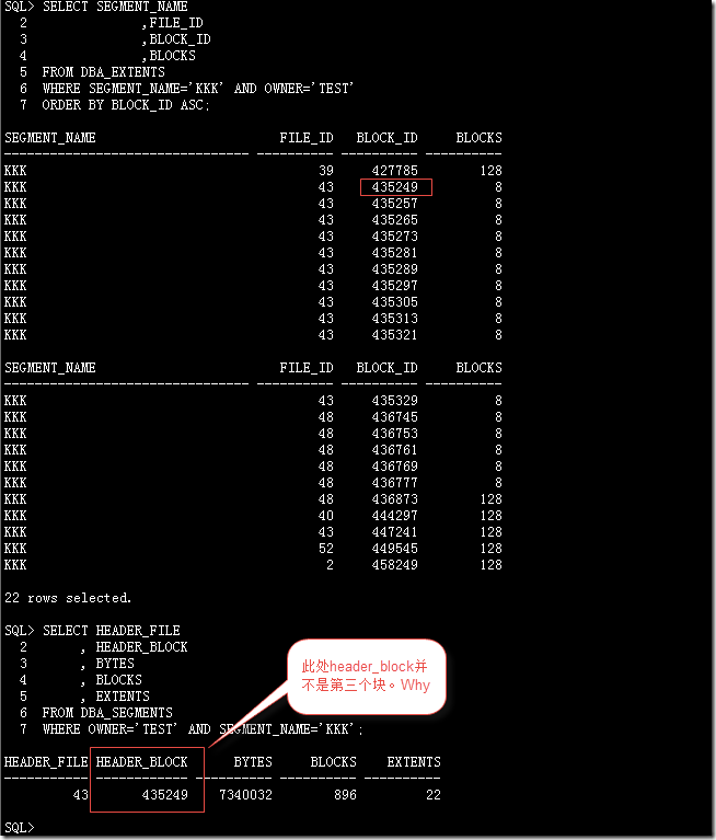 SQL> CREATE TABLE TEST1.MMM 2 AS 3 SELECT * FROM DBA_OBJECTS; Table created. SQL> COL SEGMENT_NAME FOR A32;SQL> SELECT SEGMENT_NAME 2 ,FILE_ID 3 ,BLOCK_ID 4 ,BLOCKS 5 FROM DBA_EXTENTS 6 WHERE SEGMENT_NAME='MMM' AND OWNER='TEST1' 7 ORDER BY BLOCK_ID ASC; SEGMENT_NAME FILE_ID BLOCK_ID BLOCKS-------------------------------- ---------- ---------- ----------MMM 76 9 8MMM 76 17 8MMM 76 25 8MMM 76 33 8MMM 76 41 8MMM 76 49 8MMM 76 57 8MMM 76 65 8MMM 76 73 8MMM 76 81 8MMM 76 89 8 SEGMENT_NAME FILE_ID BLOCK_ID BLOCKS-------------------------------- ---------- ---------- ----------MMM 76 97 8MMM 76 105 8MMM 76 113 8MMM 76 121 8MMM 76 129 8MMM 76 137 128MMM 76 265 128MMM 76 393 128MMM 76 521 128MMM 76 649 128MMM 76 777 128 22 rows selected. SQL> SELECT HEADER_FILE 2 , HEADER_BLOCK 3 , BYTES 4 , BLOCKS 5 , EXTENTS 6 FROM DBA_SEGMENTS 7 WHERE OWNER='TEST1' AND SEGMENT_NAME='MMM'; HEADER_FILE HEADER_BLOCK BYTES BLOCKS EXTENTS----------- ------------ ---------- ---------- ---------- 76 11 7340032 896 22