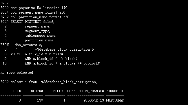 set pagesize 50 linesize 170col segment_name format a30col partition_name format a30SELECT DISTINCT file#, segment_name, segment_type, tablespace_name, partition_name FROM dba_extents a, v$database_block_corruption b WHERE a.file_id = b.file# AND a.block_id <= b.block# AND a.block_id + a.blocks >= b.block#;