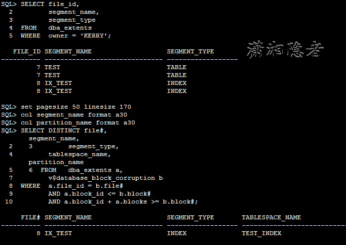 SQL> SELECT FILE_ID, 2 BLOCK_ID, 3 BLOCKS FROM DBA_EXTENTS 4 5 WHERE OWNER ='&OWNER'6 AND SEGMENT_NAME = '&TABLE_NAME'; Enter value for owner: KERRYold 5: WHERE OWNER ='&OWNER'new 5: WHERE OWNER ='KERRY'Enter value for table_name: IX_TESTold 6: AND SEGMENT_NAME = '&TABLE_NAME'new 6: AND SEGMENT_NAME = 'IX_TEST'FILE_ID BLOCK_ID BLOCKS---------- ---------- ----------8 144 88 152 8SQL> SELECT HEADER_FILE2 , HEADER_BLOCK3 , BYTES4 , BLOCKS5 , EXTENTS FROM DBA_SEGMENTS 6 7 WHERE OWNER='&OWNER' AND SEGMENT_NAME='&SEGMENT_NAME';Enter value for owner: KERRYEnter value for segment_name: IX_TESTold 7: WHERE OWNER='&OWNER' AND SEGMENT_NAME='&SEGMENT_NAME'new 7: WHERE OWNER='KERRY' AND SEGMENT_NAME='IX_TEST'HEADER_FILE HEADER_BLOCK BYTES BLOCKS EXTENTS----------- ------------ ---------- ---------- ----------8 146 131072 16 2SQL>