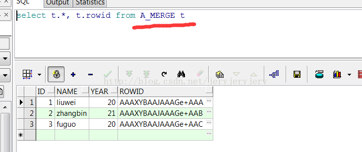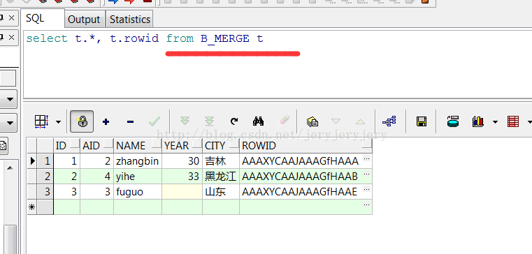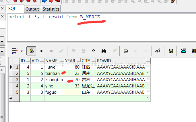 insert into A_MERGE values(1,'liuwei',20); insert into A_MERGE values(2,'zhangbin',21); insert into A_MERGE values(3,'fuguo',20); commit; insert into B_MERGE values(1,2,'zhangbin',30,'吉林'); insert into B_MERGE values(2,4,'yihe',33,'黑龍江'); insert into B_MERGE values(3,3,'fuguo',,'山東'); commit;