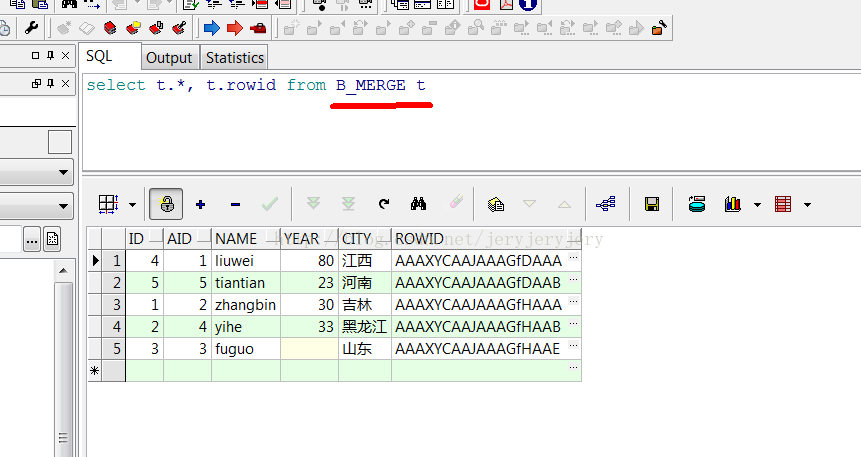 測試數據的sql代碼如下,我們在B_MERGE修改了兩個人名,并且增加了兩個人員信息,但是他們來自的省份不同,