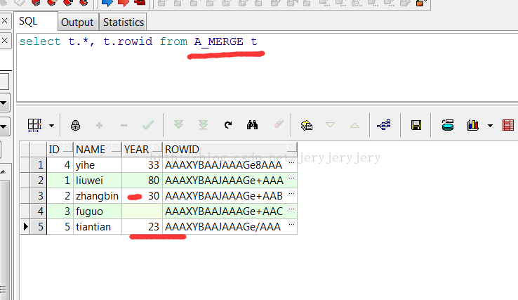 merge完之后A_MERGE表數據截圖如下:可以發現僅僅更新了AID=1的年齡,沒有插入AID=4的數據