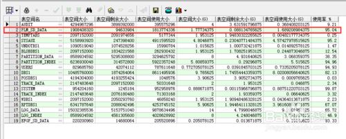 3.根據(jù)1.2 用戶對應的表空間,以及表空間的大小,可以在通過下述語句查看目前使用百分比,如果所用空間不再下述查詢范圍內,則證明此空間已經(jīng)滿了,沒有剩余量的空間在下面的SQL中沒有展示,我們可以看到有一個空間已經(jīng)到了95%