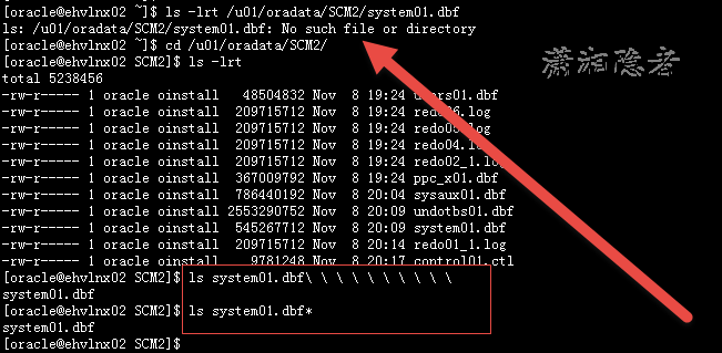 [oracle@ehvlnx02 ~]$ ls -lrt /u01/oradata/SCM2/system01.dbfls: /u01/oradata/SCM2/system01.dbf: No such file or directory[oracle@ehvlnx02 ~]$ cd /u01/oradata/SCM2/[oracle@ehvlnx02 SCM2]$ ls -lrt total 5238456-rw-r----- 1 oracle oinstall 48504832 Nov 8 19:24 users01.dbf -rw-r----- 1 oracle oinstall 209715712 Nov 8 19:24 redo06.log-rw-r----- 1 oracle oinstall 209715712 Nov 8 19:24 redo05.log-rw-r----- 1 oracle oinstall 209715712 Nov 8 19:24 redo04.log-rw-r----- 1 oracle oinstall 209715712 Nov 8 19:24 redo02_1.log-rw-r----- 1 oracle oinstall 367009792 Nov 8 19:24 ppc_x01.dbf -rw-r----- 1 oracle oinstall 786440192 Nov 8 20:04 sysaux01.dbf -rw-r----- 1 oracle oinstall 2553290752 Nov 8 20:09 undotbs01.dbf -rw-r----- 1 oracle oinstall 545267712 Nov 8 20:09 system01.dbf -rw-r----- 1 oracle oinstall 209715712 Nov 8 20:14 redo01_1.log-rw-r----- 1 oracle oinstall 9781248 Nov 8 20:17 control01.ctl[oracle@ehvlnx02 SCM2]$ ls system01.dbf/ / / / / / / / / / system01.dbf [oracle@ehvlnx02 SCM2]$ ls system01.dbf*system01.dbf [oracle@ehvlnx02 SCM2]$ clip_image001