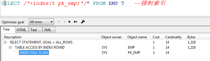 SELECT /*+index(t pk_emp)*/* FROM EMP T --強制索引,/*.....*/第一個星星后不能有空格,里邊內容結構為:加號index(表名 空格 索引名)。--如果表用了別名,注釋里的表也要使用別名。