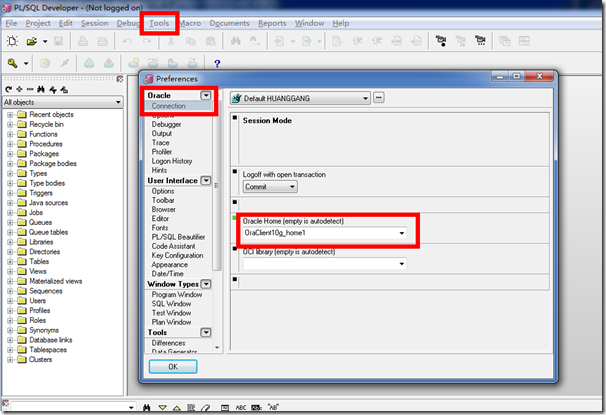 當我安裝好PLSQL Developer軟件后登陸時任然出現了“ORA-12154: TNS: 無法解析指定的連接標識符”,如果是Win7,Win8用戶甚至可以會出現彈出一個白框的情況,這時需要以管理員身份運行PLSQL Developer,并且確保你的PLSQL Developer是讀取的oracle客戶端配置,直接取消登陸,在PLSQL Developer工具欄中找到“Tools―>Preferences”,在Oracle的Connection節點中找到Oracle Home選擇OraClient10g_home1,保存后關閉PLSQL Developer就可以正常登陸了。