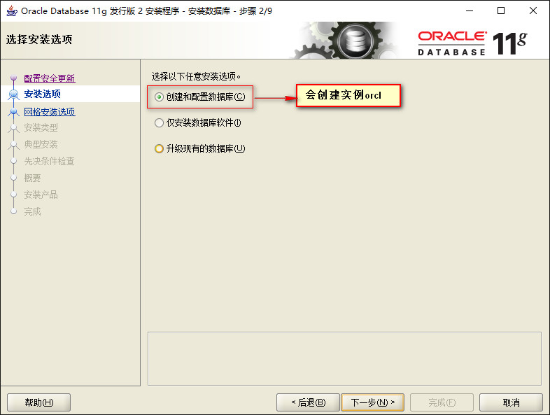 4) 選擇創(chuàng)建和配置數(shù)據(jù)庫(這樣數(shù)據(jù)庫安裝完成后,會(huì)默認(rèn)創(chuàng)建數(shù)據(jù)庫實(shí)例orcl)
