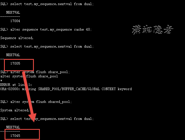 SQL> select test.my_sequence.nextval from dual; NEXTVAL---------- 17004SQL> alter sequence test.my_sequence cache 40;Sequence altered.SQL> select test.my_sequence.nextval from dual; NEXTVAL---------- 17005SQL> alter system flush share_pool;alter system flush share_pool*ERROR at line 1:ORA-02000: missing SHARED_POOL/BUFFER_CACHE/GLOBAL CONTEXT keywordSQL> alter system flush shared_pool;System altered.SQL> select test.my_sequence.nextval from dual; NEXTVAL---------- 17045